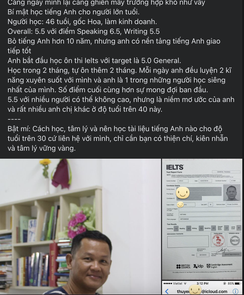 Phương pháp ôn luyện chuyên sâu tốc độ cao đã đồng hành với nhiều học viên U40 – 60 thành công vực dậy nền tảng & đạt mức điểm 5.5 – 6.5 IELTS từ số 0 trong vòng dưới 6 tháng.