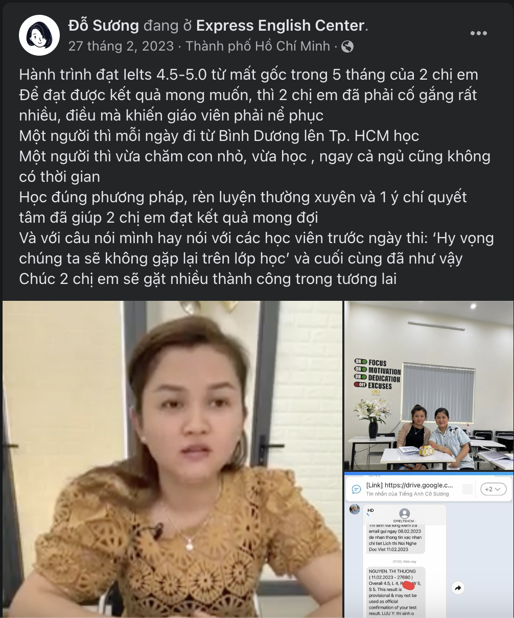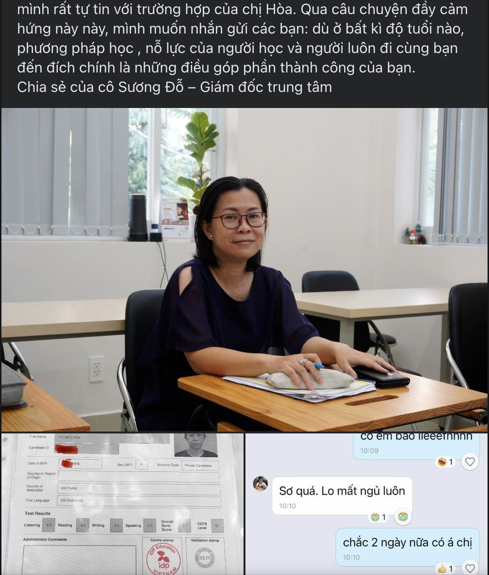 Trong thời gian ngắn (dưới 6 tháng), tất cả học viên đều có thể bắt đầu giao tiếp và đạt được thành tích kỳ vọng trong kỳ thi IELTS để đi làm, định cư ở nước ngoài mặc dù trước đó hoàn toàn mịt mờ trước tiếng Anh.